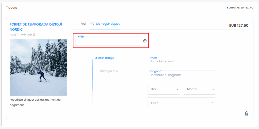 Clica a Carregar tiquet i introdueix la numeració WTP que trobaràs al teu forfet de l’any passat!